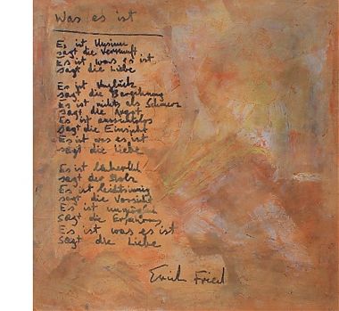 2003, 60×60cm, Acrylfarben-Mischtechnik auf Papier-Kastenleinwand bearbeiteter Scan des Gedichtes von Erich Fried in der Handschrift des Dichters